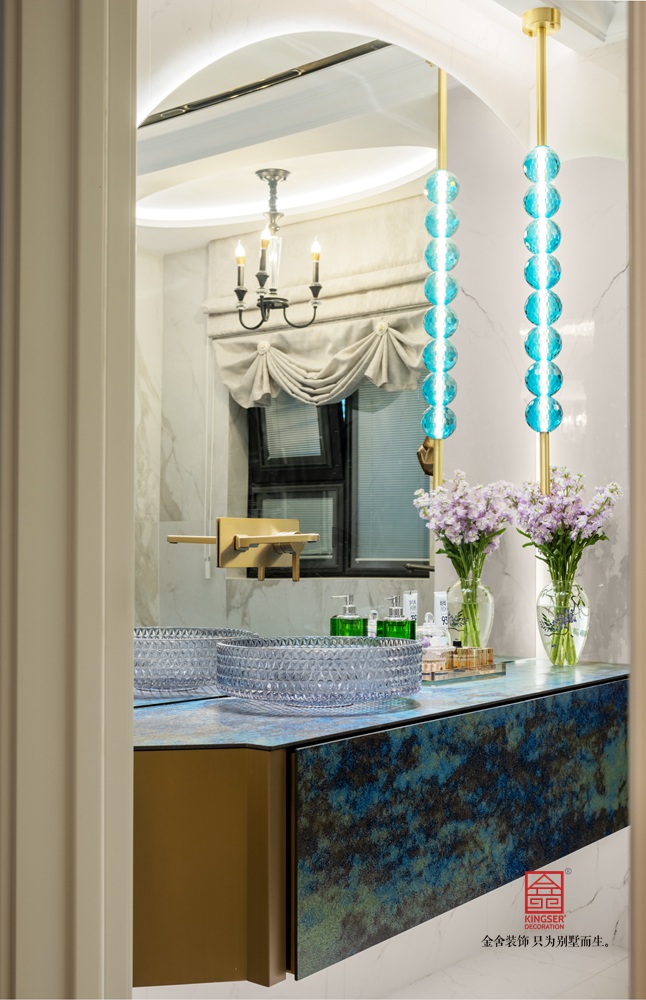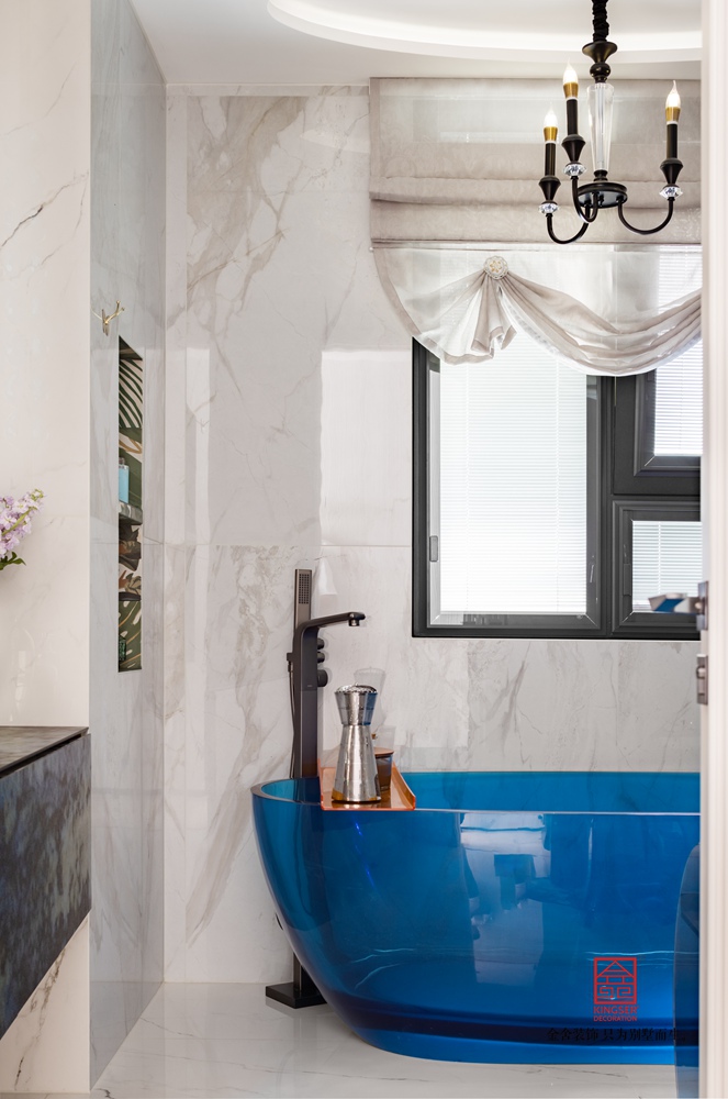 蓝色多瑙河是这个空间的主调,不同纯度,明度,亮度的蓝色,让空间高级浪漫,主卫打分最高,纯纯的法式浪漫情怀,浅海蓝的透明浴缸,加之金属铜色,奢华感十足。