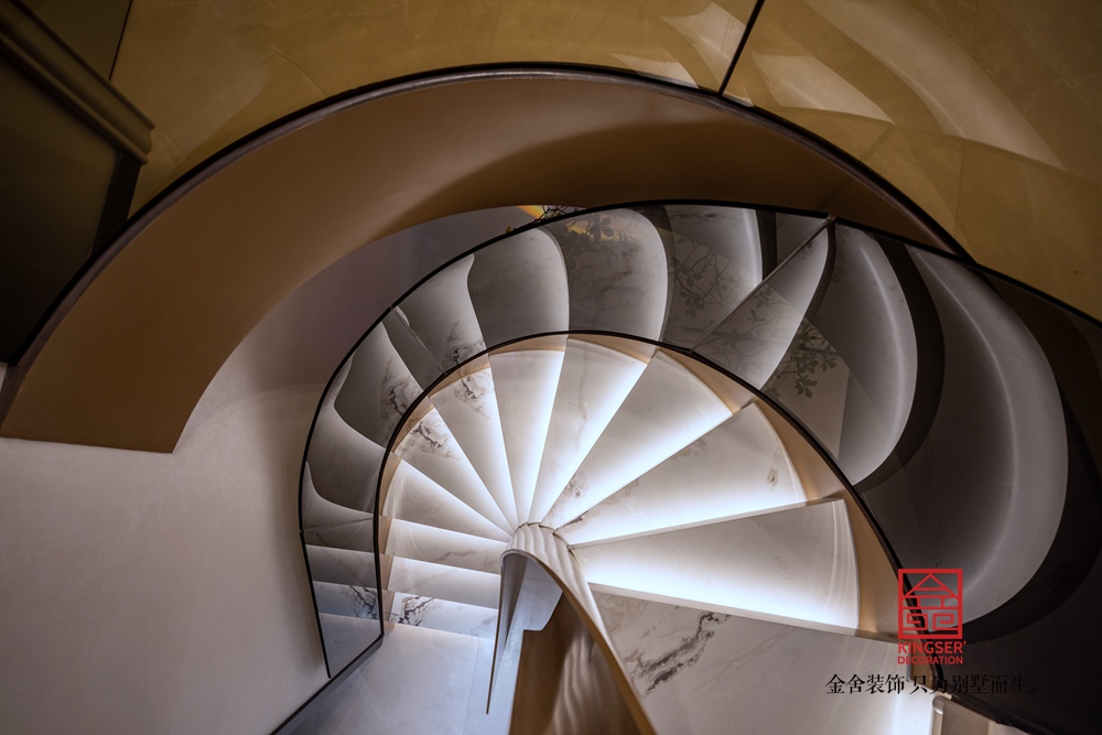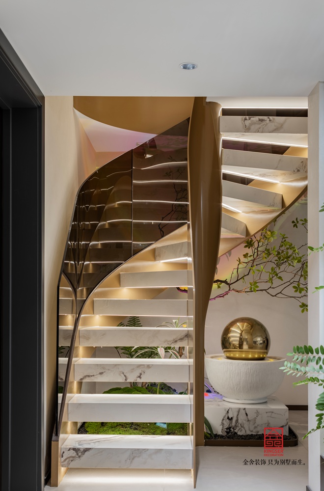 螺旋线条复刻鹦鹉螺自然韵律,金属扶手勾勒利落光影,石材踏板沉淀温润质感。刚柔碰撞间,让楼梯不止是通行空间,更成为家居里自带焦点的艺术装置。