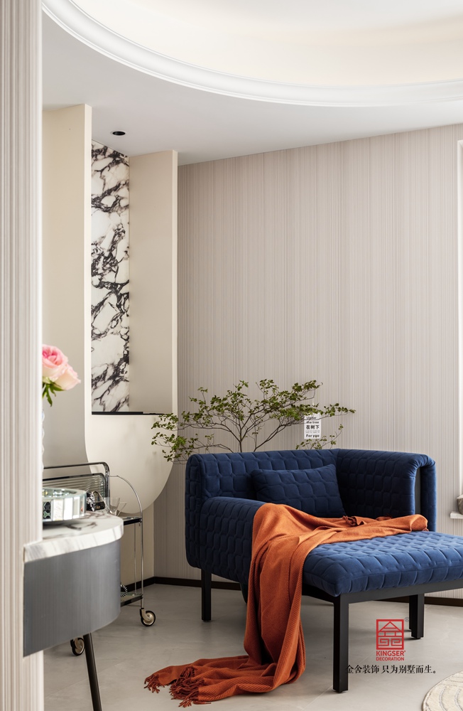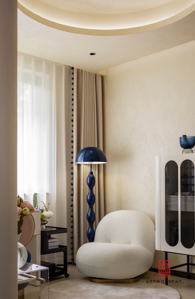 一楼空间以奶油白,深灰蓝,香槟金,三种主色交织出温柔治愈的基底。