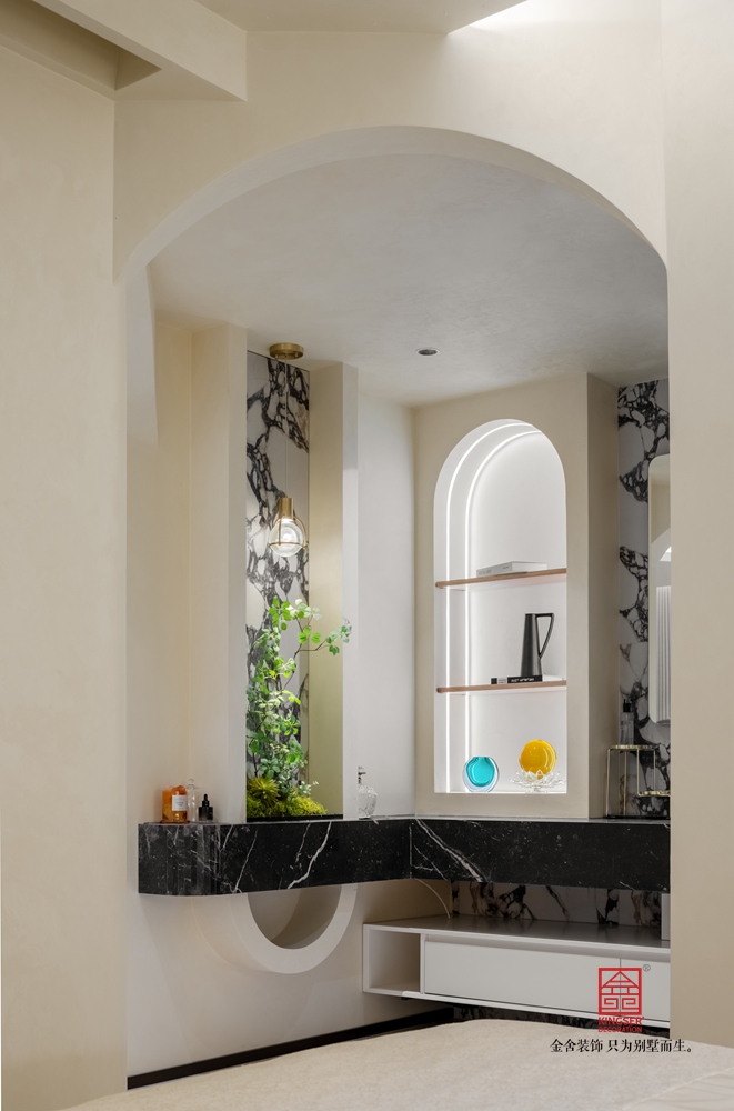 女孩房是典型的奶油风,通过两房变一房的手法,再通过两道拱形造型,使得两个空间分离又关联,更为突出的是干区洗手台,宝格丽极具时尚感的材质和负一女孩房衣帽间玄关遥相呼应,整体感兼具。