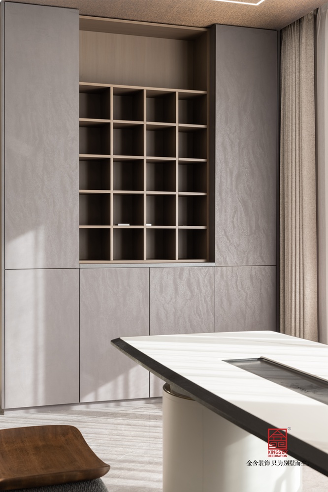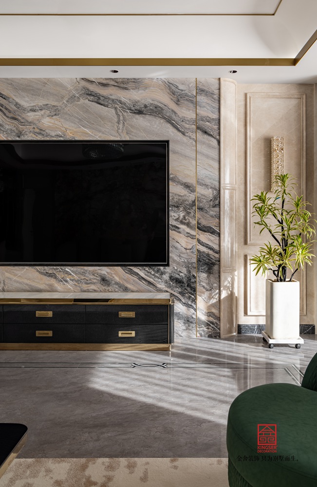 如滔滔江水倾泻而下的石材肌理,赭石与黑色的颜色对撞,石材的坚硬与皮制的温润的融合,金属的边缘与整体温暖的配色,这是客户对生活的向往,也是对美好未来的构建。