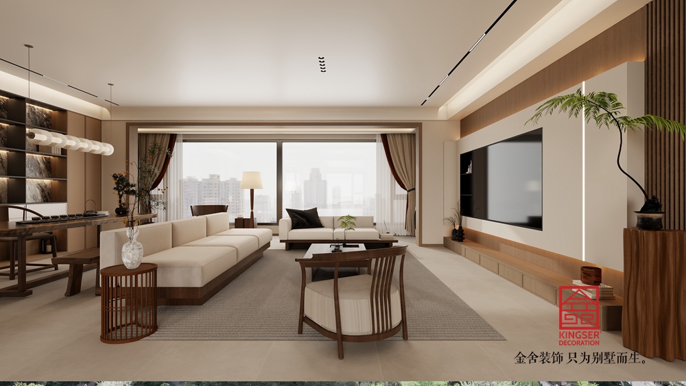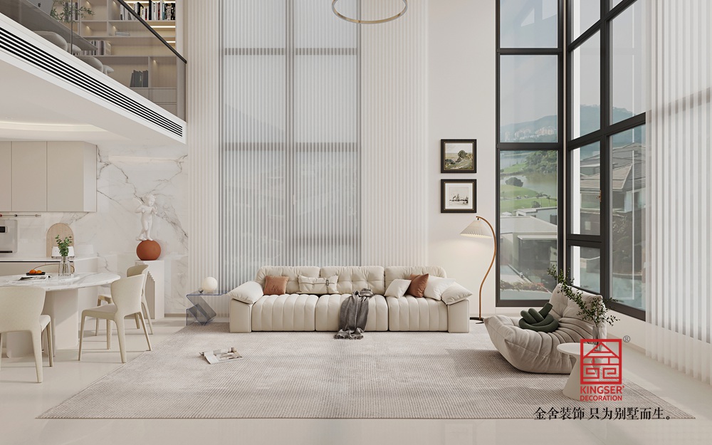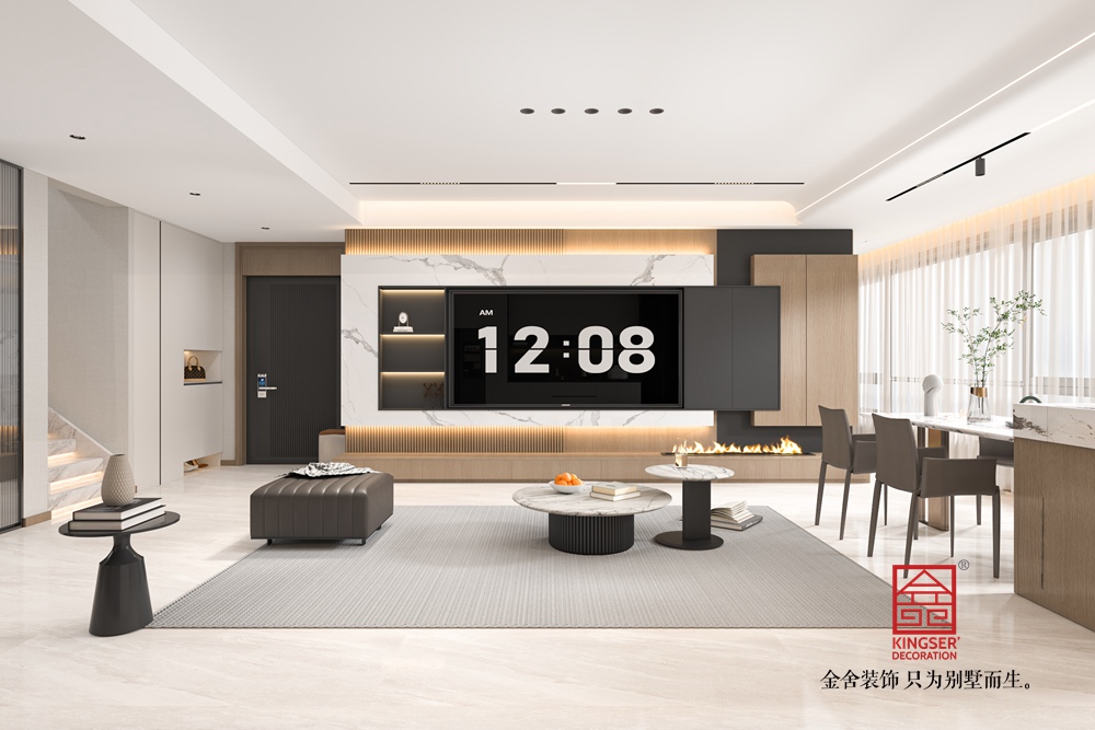 设计说明:此案例为石家庄金舍装饰-荣盛华府190平米现代极简风格装修效果图。现代人面临着城市的喧嚣和污染,激烈的竞争压力,还有忙碌的工作和紧张的生活。因而更加向往清新自然、随意轻松的居室环境。越来越多的都市人开始摒弃繁缛豪华的装修,力求拥有一种自然简约的居室空间。少即是多,以宁缺勿滥为精髓,合理的简化居室,从简单舒适中体现生活的精致,体块构成把所有的内容糅合在一起,又让喧闹中有了主线,有了宁静,给人以心灵的休憩。