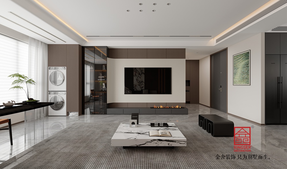 中式风格的室内设计古朴典雅,能反映出强烈的民族文化特征,使观者很容易理解其文化内涵,特别是对国人和对古文化兴趣浓厚的人 更是有着一种莫名的亲和力,所以设计师根据业主喜爱中国古文化的需求 采用了中式风格的设计,但是在室内的中式设计中要注意加入现代的元素,比如客厅中拥有着现代元素蓝色基调的坐垫以及抽象装饰画搭配上深红色实木家具展现出了中式元素和现代材质的巧妙兼容,同时顶面轻质深色木梁以及电视背景墙水墨画的相结合透漏出一种沉稳而源远流长的中国传统文化,这种绝妙的组合给人以强烈的视觉冲击,将时尚与古典巧妙的相结合,再加上补充光的暖色 使整个空间更加的舒适而具有层次感,又符合现代人追求的典雅、实用性。