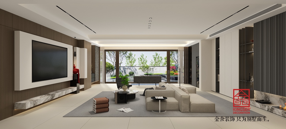 材质上,木质墙面传递自然温润,大理石元素增添精致感,不同材质的碰撞让层次更丰富。布局上,宽大的米色组合沙发成为空间核心,围绕电视背景墙,构建出舒适的社交与休憩场域,背景墙简约大气,与整体风格相得益彰。