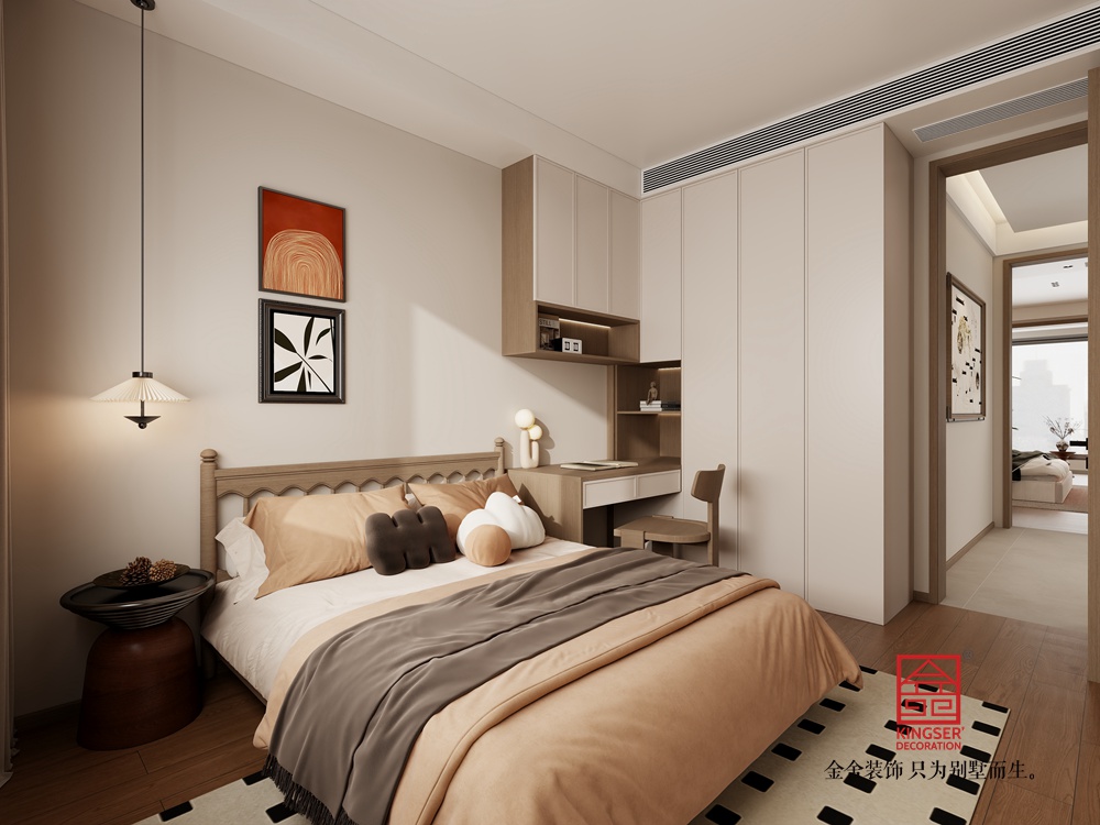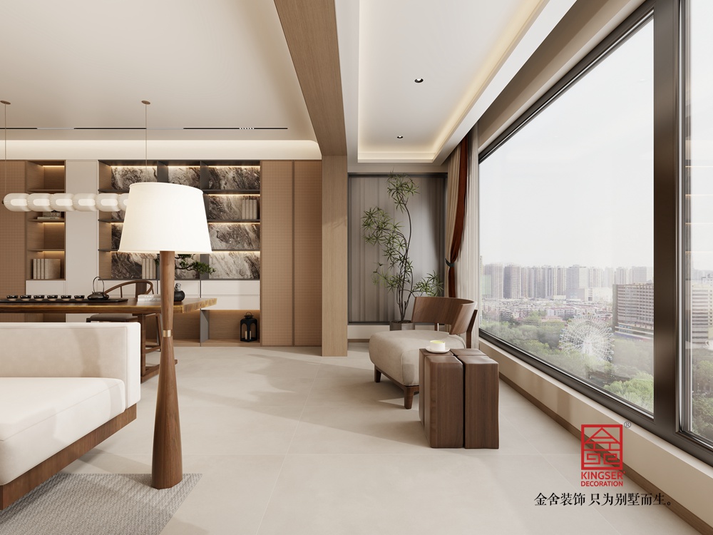 宽阔的落地窗引入充足自然光线,搭配雅致的窗帘,让室内外景致交融。空间中点缀的绿植、中式摆件,以及墙上的简约装饰,都为空间增添了文化气息与自然意趣,打造出一个兼具实用性与美学价值,能让人在现代生活中感受东方美学底蕴的惬意居所。