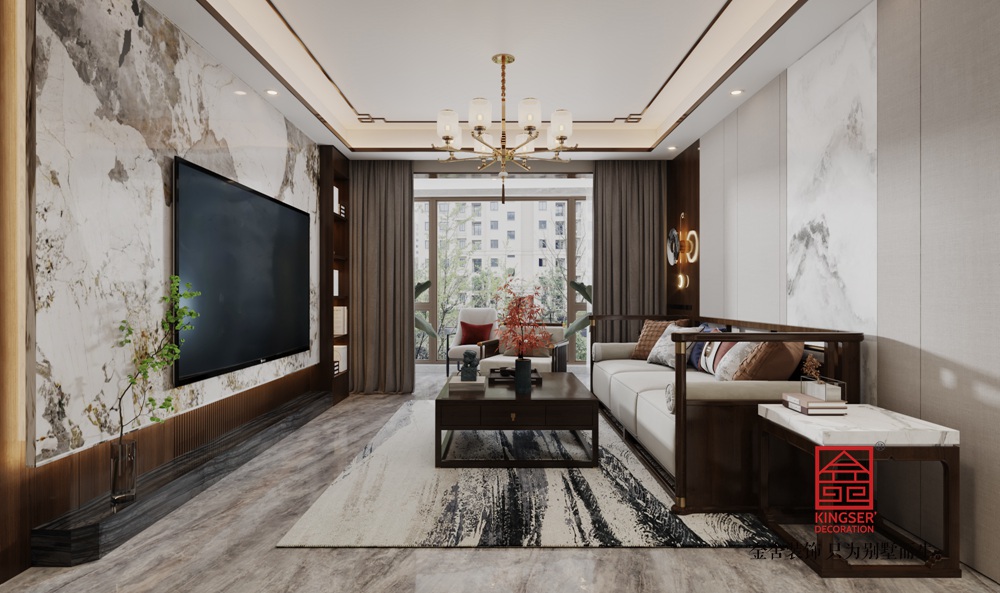 家具造型汲取中式传统形制精髓,线条简洁流畅,实木框架搭配软包,既保留古朴韵味,又具现代舒适感。墙面的山水纹理装饰、精致的中式吊灯,以及茶几上的瓷器摆件,处处彰显中式美学的雅致。