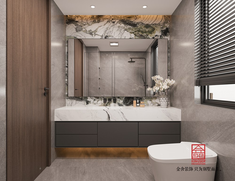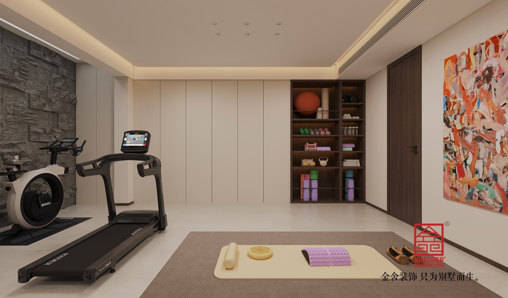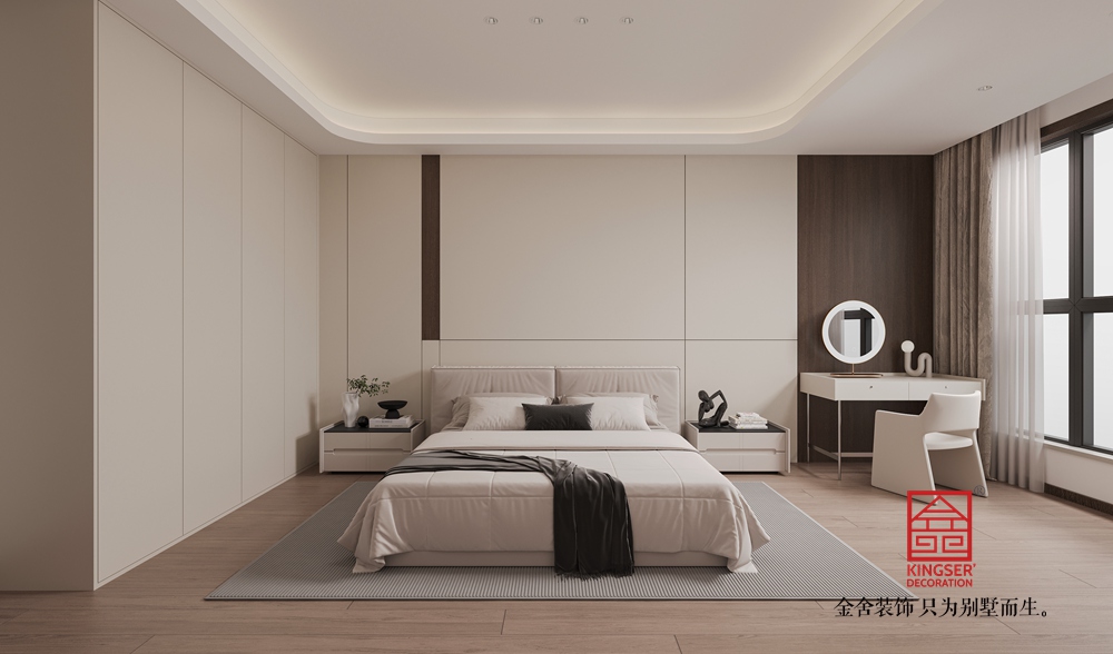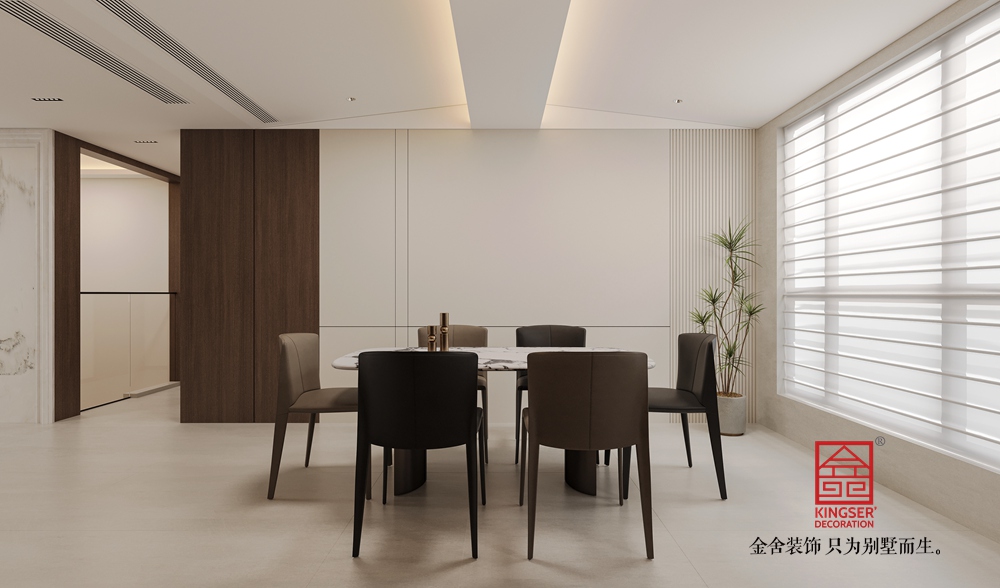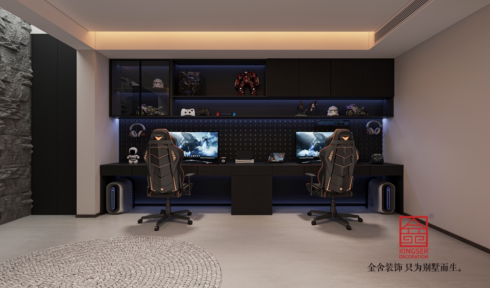 采用开放式布局,将观影、休憩功能有机整合。线性灯光设计强化了空间纵深感,隐藏式灯带与点光源结合,营造出柔和且富有层次的照明效果;大面积落地窗搭配百叶帘,保证采光的同时兼顾隐私,让空间在通透与雅致间找到平衡。
